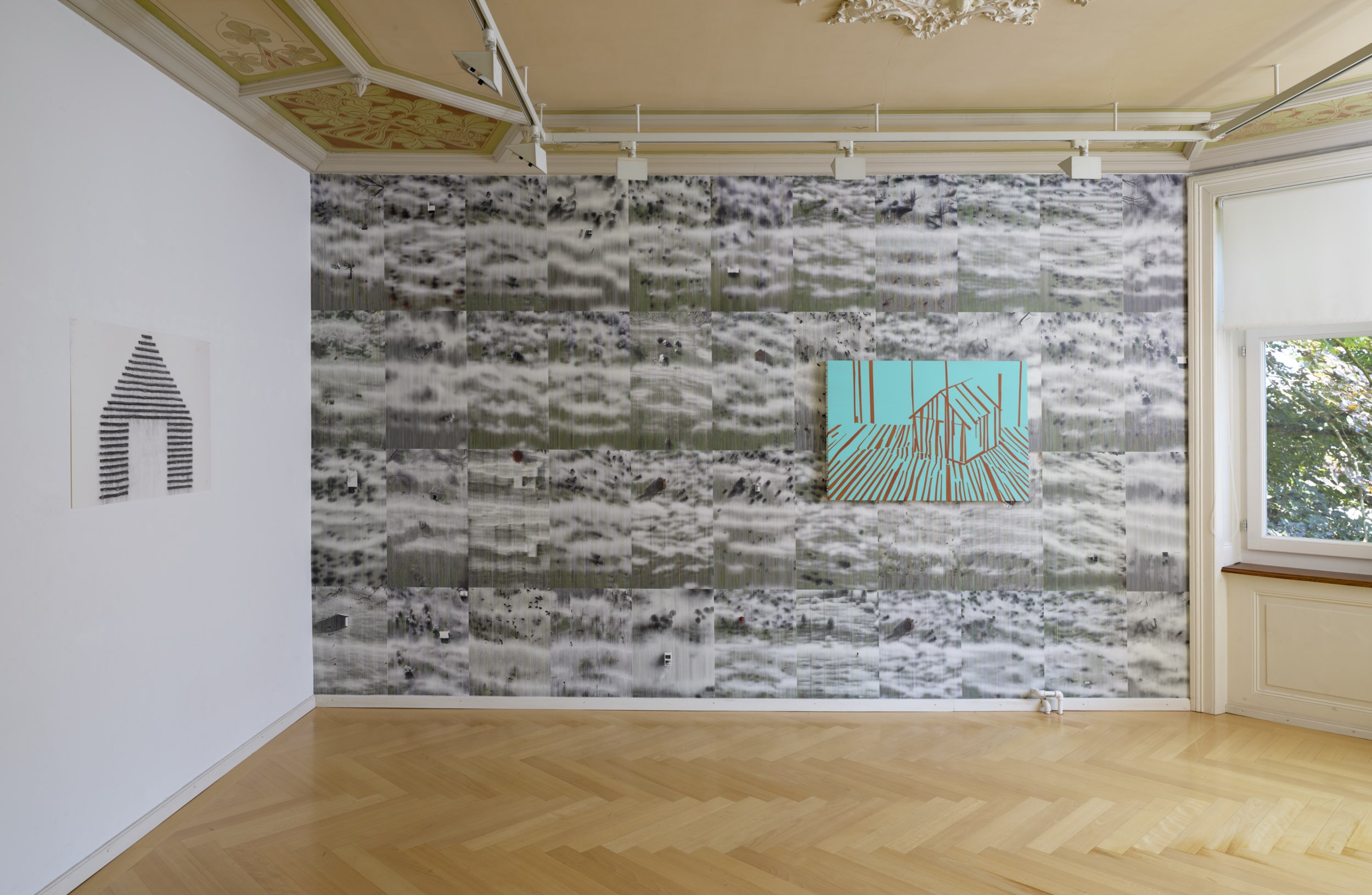 Maison, 2019, graphite sur papier, 59 x 84 cm - Abris, 2024, papier peint, dimensions variables - Abri 8, peinture acrylique et ruban adhésif sur bois, 70 x 100 cm