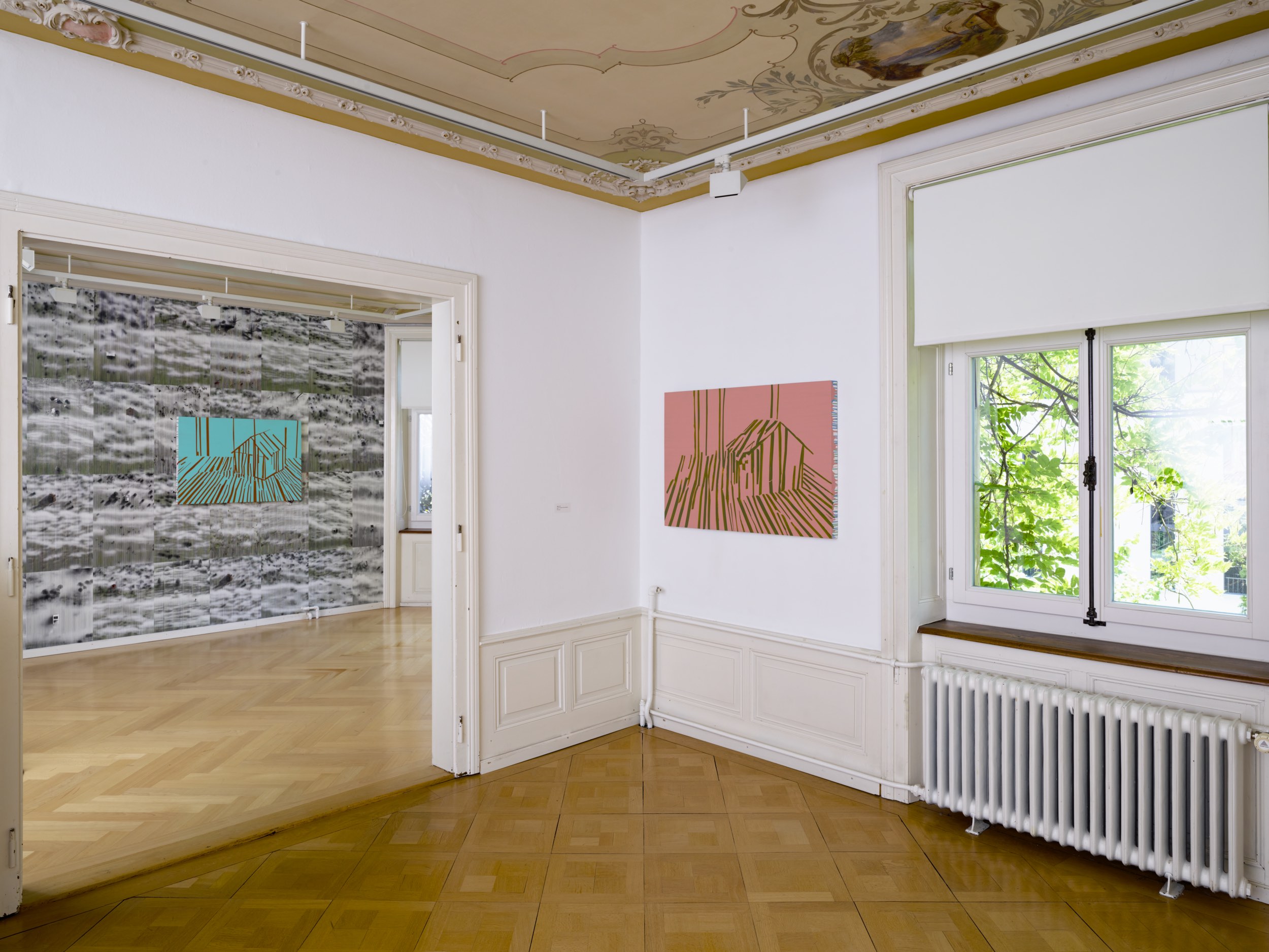 Lors du rendu d'une modélisation 3D d'un paysage, un problème (bug) est survenu dans le calcul délivré. Une trame régulière est alors apparue par accident. Michel Huelin l’a appréhendée comme une opportunité et en a réalisé une œuvre : Landscape Recovery 1 (bug), 2009. En 2024, cette œuvre est devenue le point de départ du papier peint Abris. Elle a été modifiée au moyen d’une intelligence artificielle générative afin d’obtenir une nouvelle création, représentant des ébauches de constructions dans un environnement évoquant des vues aériennes. L’artiste propose ici une étrange « récupération du paysage », selon le titre de l'œuvre de 2009. Par le biais d’erreurs de calcul et des algorithmes hermétiques de l’IA, il interroge la stabilité du paysage à l’ère des changements climatiques. Aux rares habitations parsemées dans ce papier peint répondent les tableaux également intitulés Abris, représentant des maisons isolées, traitées à la peinture et au scotch. Elles évoquent des maquettes et paraissent fragiles, ouvertes, transparentes, bien loin de la fonction traditionnelle d’abri attachée à l’architecture. Michel Huelin déconstruit autant qu’il construit ses structures architecturales et questionne le rôle et la validité de l’Habitable à l’ère des catastrophes naturelles et des migrations.